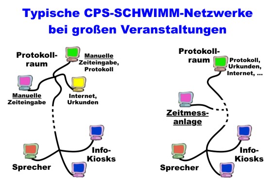 Das vorliegende Programm CPS-SCHWIMM befähigt nun Ihren Computer, Ihnen bei allen Schwimmveranstaltungen hilfreich zur Seite zu stehen. Im Gegensatz zu gleichgelagerten Programmen anderer Hersteller haben Sie mit CPS-SCHWIMM ein solches, welches kein Spezialprogramm für die eine oder andere Veranstaltungsart, sondern bei allen möglichen Wettkämpfen einzusetzen ist. Eine Anschaffung von Zusatzsoftware erübrigt sich also. Aus der Windows®-Oberfläche resultiert auch die Netzwerkfähigkeit von CPS-SCHWIMM, mit der es möglich ist, an mehreren Rechnern gleichzeitig zu arbeiten und stets auf einen gemeinsamen Datenstand zurückzugreifen. Bei modernen Veranstaltungen sieht das Netzwerk beispielsweise so aus: