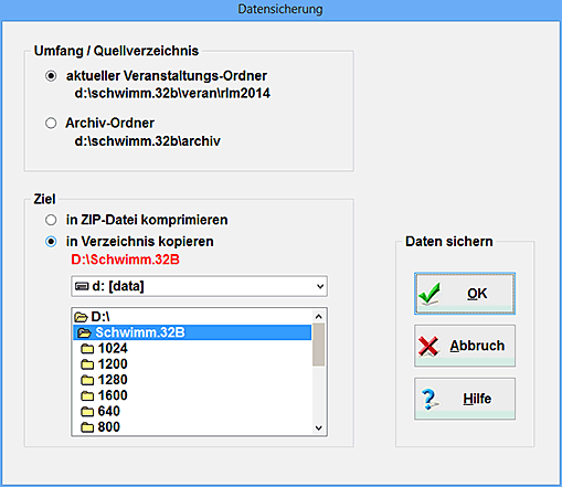 Geben Sie als Verzeichnis den Namen an, in dem Ihre Veranstaltung von nun an gespeichert sein soll. Das bisherige Verzeichnis wird anschließend gelöscht. Ein solches Verschieben bietet sich dann an, wenn Sie die Veranstaltung bisher im Verzeichnis "Barbara" speicherten, das Barbaraschwimmen aber auch in den nächsten Jahren durchführen möchten; dabei wird es sicherlich sinnvoll werden, das "alte" Verzeichnis "Barbara_2011" und die "neuen" Verzeichnisse "Barbara_2012", "Barbara_2013", "Barbara_2014" usw. zu nennen.