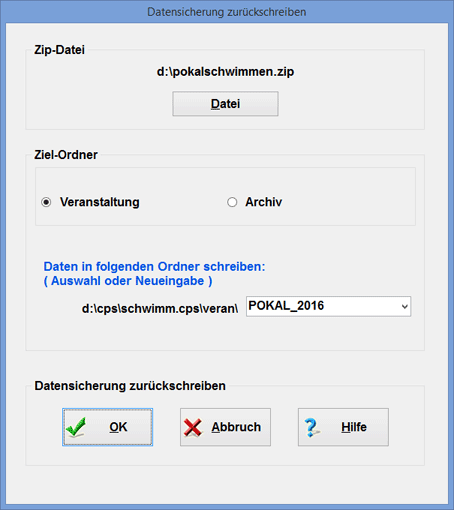 Nachdem Sie mit Hilfe des Schalters Datei die ZIP-Datei ausgewählt haben, die Sie dekomprimieren möchten, müssen Sie zunächst angeben, ob es sich bei der ausgewählten ZIP-Datei um die Datensicherung einer Veranstaltung oder des Archiv-Ordners handelt.