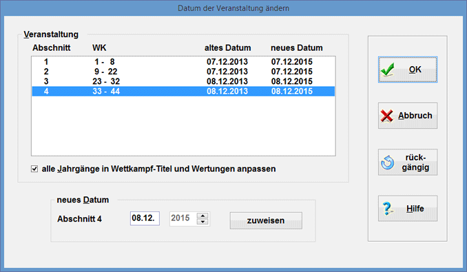 Wählen Sie der Reihe nach alle Abschnitte an und weisen diesen das neue Datum zu. Der OK-Schalter ist nur bereit, wenn für alle Abschnitte ein neues Datum eingegeben wurde. Mit dem Schalter rückgängig können Sie Ihre Eingaben verwerfen und komplett neu beginnen.