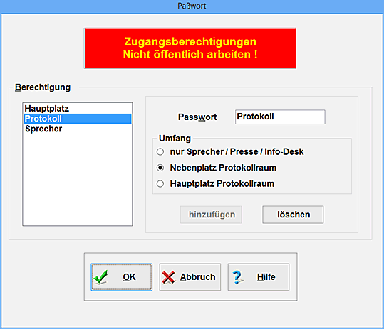 Geben Sie hier die Passworte ein, mit denen sich andere Anwender in Veranstaltungen auf Ihrem Rechner anmelden können. Für jedes Passwort können Sie die zugelassenen Aufgabenbereiche festlegen. Die vergebenen Passworte beziehen sich immer auf alle Veranstaltungen, die im Rechner gespeichert sind; eine Begrenzung der Veranstaltungen findet nicht statt. Das Passwort muss mindestens 4 und höchstens 10 Anschläge lang sein. Es sind nur Buchstaben erlaubt.