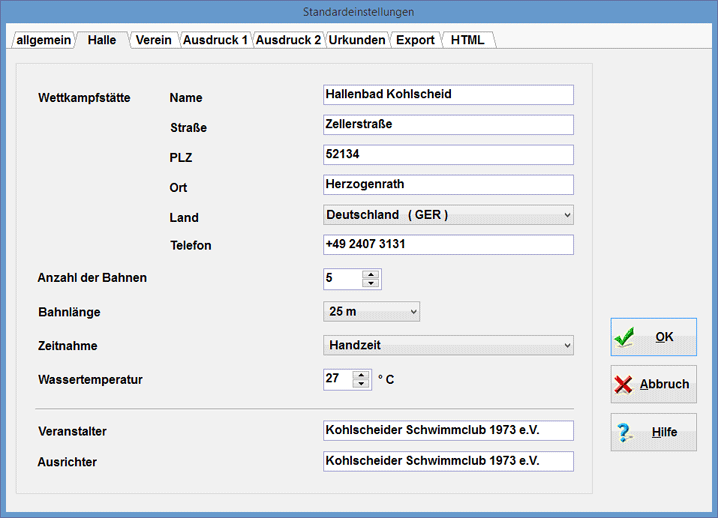 Auf der Seite "Halle" können Sie Angaben zur Schwimmhalle machen, in der Ihre Veranstaltungen normalerweise stattfinden. Die hier angegebene Wettkampfstätte sowie die Angaben zum Veranstalter und Ausrichter werden Ihnen später bei der Anlage einer neuen Veranstaltung [Kapitel 1.1.1] vorgeschlagen; findet Ihre Veranstaltung "außerhalb" statt, so können Sie ihn selbstverständlich überschreiben. Die hier festgelegte Anzahl der Bahnen erscheint bei der Anlage eines neuen Wettkampfes [Kapitel 2.2] ebenfalls als Vorgabe. Für den Export nach dem DSV-Standard [Kapitel 9.6] können Sie hier die vorzuschlagende Bahnlänge hinterlegen, ebenso die Art der Zeitnahme.