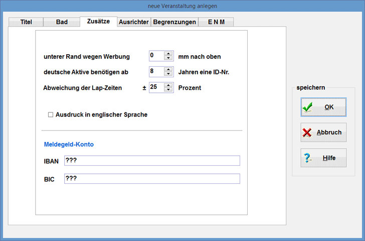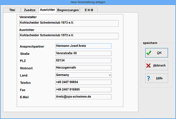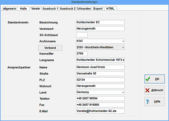 Wenn Sie auf dieser Seite einen Vereinsnamen hinterlegen, so wird dieser Verein bei jeder neuen Veranstaltung [Kapitel 1.1.1] automatisch angelegt. Es ist also sinnvoll, auf dieser Seite den eigenen Verein zu hinterlegen. Damit brauchen Sie diesen nicht bei jeder Veranstaltung neu zu schreiben; Ihr eigener Verein nimmt ja normalerweise bei Ihren eigenen Veranstaltungen teil.