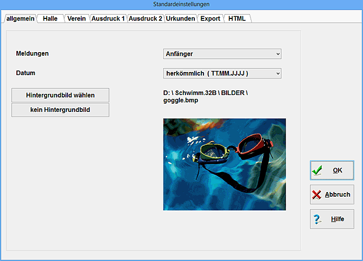 Zur Auswahl von Hintergrundbildern werden Ihnen alle gif-, jpg- und bmp-Dateien vorgeschlagen, die im CPS-SCHWIMM-Unterverzeichnis "Bilder" liegen. Wenn Sie kein Hintergrundbild möchten, so betätigen Sie einfach den Schalter "kein Hintergrundbild".