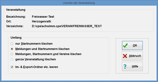 Es werden alle Vereine samt zugehörigen Aktiven und Meldungen gelöscht; die Veranstaltung als solche sowie die Wettkampf-Folge [Kapitel 2.2] bleiben erhalten. Somit ist es möglich, eine Veranstaltung des letzten Jahres ohne viel Mühe erneut durchzuführen.