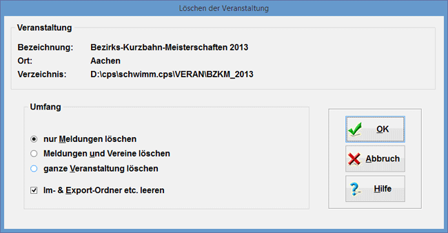 Mit diesem Dialog können Sie eine Veranstaltung ganz oder teilweise löschen. Hierbei haben Sie die Wahl, ob Sie nur die Meldungen zu dieser Veranstaltung oder die ganze Veranstaltung löschen wollen.