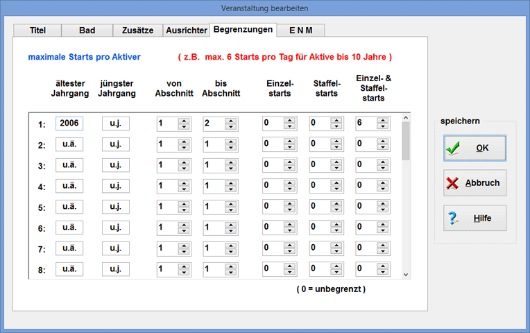 Bitte beachten Sie, dass die Anzahl der maximalen Starts pro Tag davon abhängen kann, an welchem Datum die Veranstaltung stattfindet. So kann es durchaus sein, dass 10-jährige bis zum 31.08. einer Beschränkung unterliegen, aber ab dem 01.09. beliebig oft starten dürfen. Bei einer Veranstaltung ab September stellen Sie die Beschränkung dann z.B. wie folgt ein: "max. 6 Starts / Tag für Aktive bis 9 Jahre".