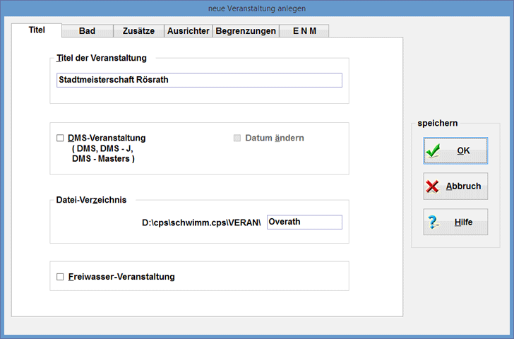 Für eine neue Veranstaltung sind zunächst einmal der Name der Veranstaltung, der Veranstaltungsort und das Verzeichnis anzugeben, in dem Ihre neue Veranstaltung gespeichert werden soll. Für das "Datei-Verzeichnis" stehen maximal 16 Anschläge zur Verfügung; auch sind nicht alle Sonderzeichen erlaubt.
