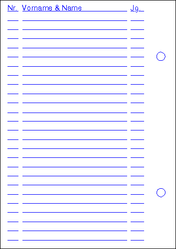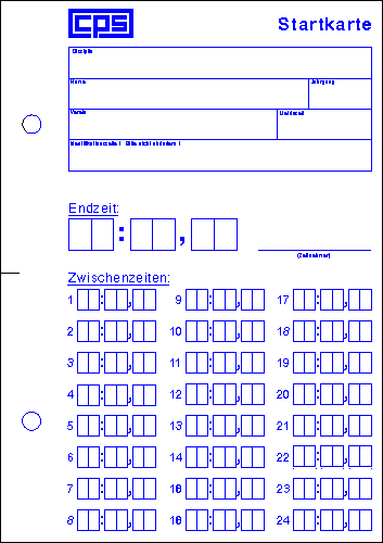 Bei diesen (inzwischen ebenfalls veralteten) CPS-Startkarten ist am linken Rand ausreichend Platz zum Lochen, damit Sie im Vorfeld der Veranstaltung für jeden Zeitnehmer einen eigenen Ordner anlegen können. Damit ist die Seitenbreite gleich der von DIN A4 (21,0 cm), die Länge ist jedoch ein wenig höher (30,48 cm). Ansonsten sind sie aber mit den oberen identisch. | |