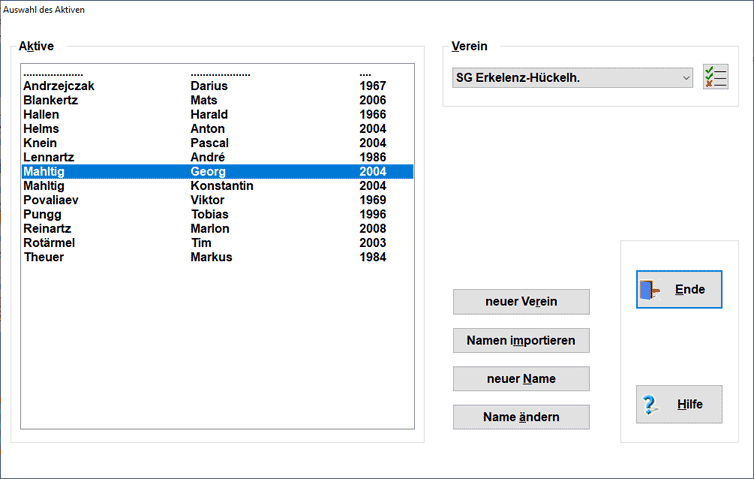 Sofern ein Verein ausgewählt wurde, finden Sie eine Auflistung aller Aktiven dieses Vereins. An manchen Programmstellen werden zusätzlich die Aktiven aufgelistet, die im Archiv des aktuellen Vereins [Kapitel 6.2] gespeichert sind. Zur Anlage eines neuen Vereins oder zur Korrektur eines bestehenden Vereins [Kapitel 6.2] drücken Sie den Schalter neuer Verein. Der Schalter neuer Name dient zur Anlage eines neuen Aktiven.