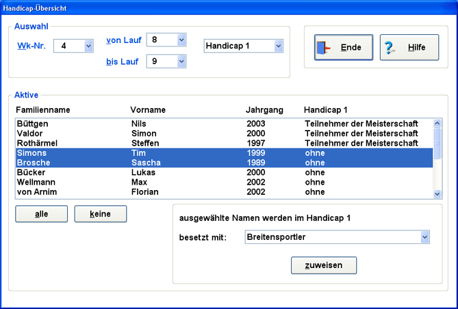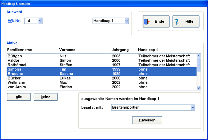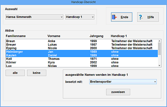 Haben Sie das Handicap gefunden, das Sie den Aktiven zuweisen wollen (z.B. "Breitensportler"), so betätgen Sie den Schalter zuweisen.