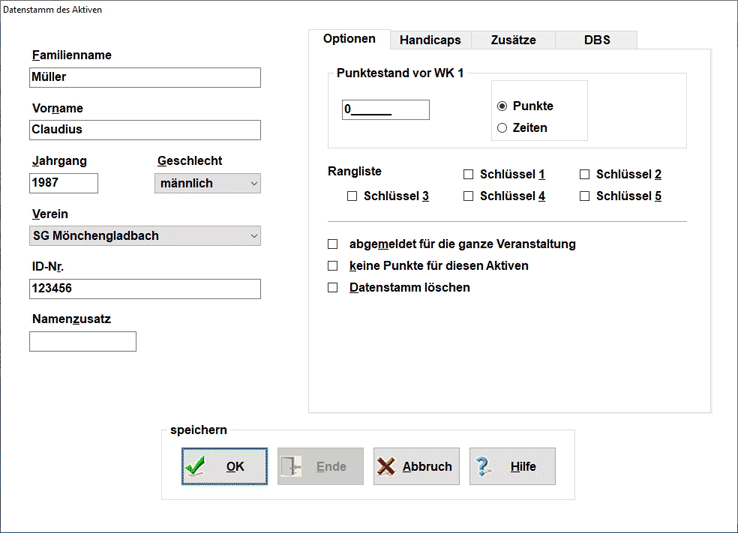 Mit der Option keine Punkte können Sie den Aktiven mit allen seinen Meldungen von der Punktewertung [Kapitel 2.2.3.2] ausschließen. Dies ist manchmal gewünscht, wenn ein überdurchschnittlicher Schwimmer zwar mitschwimmen, aber bei der Punktewertung außen vor bleiben soll.