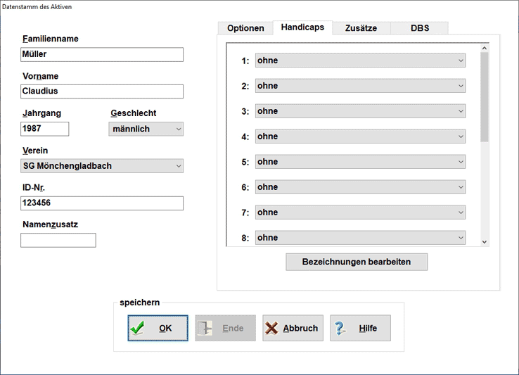 Jedem Aktiven können verschiedene Handicaps zugeordnet werden [Kapitel 6.1], die an dieser Stelle des Programms verwaltet werden. Damit werden innerhalb einer Wertung (Jahrgang, Altersklasse) weitere Wertungen möglich (für jedes Handicap eine eigene Wertung).