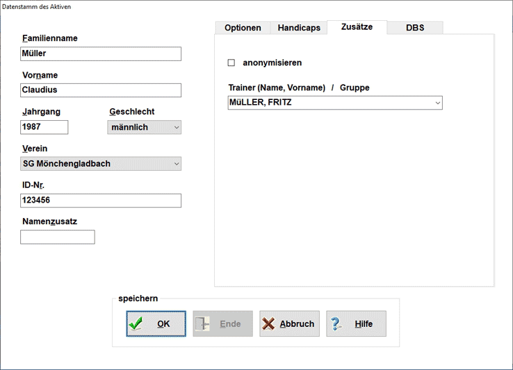 Jedem Aktiven kann ein Trainer zugeordnet werden. Auf diesen wird Bezug genommen, wenn beim Ausdruck des Meldeergebnisses [Kapitel 5.2] der Verein markiert und zusätzlich eine Trainer-Differenzierung gewünscht wird.