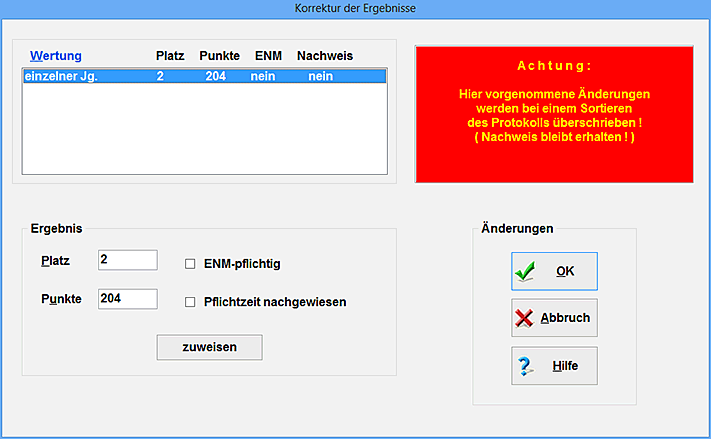 Mit dem Schalter zuweisen werden die von Ihnen vorgenommenen Änderungen in die Wertungsliste eingearbeitet.