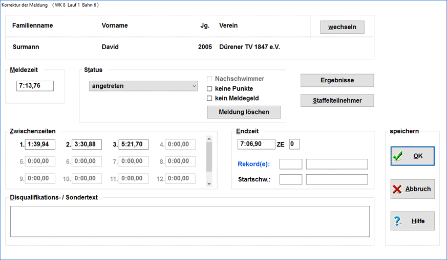 | disqualifiziert | Der Schwimmer wurde disqualifiziert. Den betreffenden Disqualifikationstext tragen Sie bitte in das untere große Eingabefeld ein. |