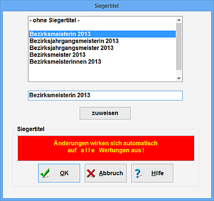 Insbesondere bei amtlichen Veranstaltungen erhhalten die Sieger einen Titel. Diese Siegertitel können Sie hier hinterlegen und bearbeiten.