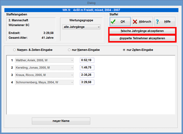 Ebenso überprüft das Programm, ob ein Teilnehmername mehrfach innerhalb einer Staffel auftaucht. Auch in diesem Fall wird der OK-Schalter erst durch den Schalter doppelte Teilnehmer akzeptieren wieder freigegeben.