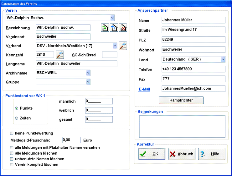 Wann immer Sie einen neuen Verein anlegen oder einen bestehenden Verein korrigieren möchten - Sie gelangen immer zu diesem Dialog; denn hier sind alle Daten gespeichert, die für den Vereinsnamen relevant sind: