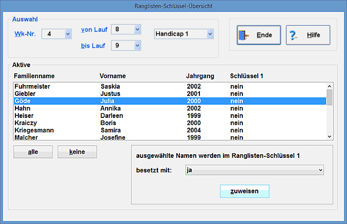 An dieser Stelle des Programms können Sie die einzelnen Ranglisten-Schlüssel [Kapitel 6.1] auf die Aktiven verteilen.