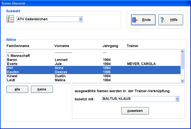 An dieser Stelle des Programms können Sie einzelnen Aktiven [Kapitel 6.1] die zugehörigen Trainer zuordnen.