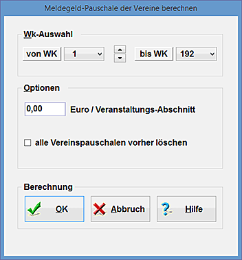 Sofern die Meldegeld-Pauschale aber davon abhängt, in welchem Veranstaltungs-Abschnitt der Verein meldet, so ist die Berechnung der Pauschale komplexer. Mit dem hier vorliegenden Dialog können Sie diese vereinsspezifische Meldegeld-Pauschale für alle Vereine berechnen lassen.