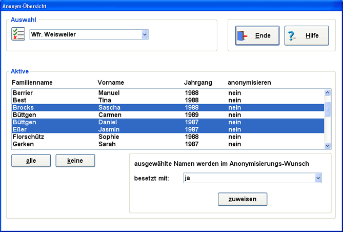 An dieser Stelle des Programms können Sie die Anonymisierungs-Wünsche [Kapitel 6.1] auf die Aktiven verteilen.