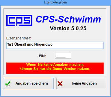 Wenn Sie CPS-SCHWIMM zum ersten Mal starten, so müssen Sie zunächst Ihre Lizenzdaten eingeben. Bitte achten Sie darauf, dass Sie den Namen des Lizenznehmers exakt so eingeben, wie er Ihnen zusammen mit der PIN mitgeteilt wurde. Schreiben Sie z.B. "TUS" an Stelle von "TuS" oder geben Sie zwischen den einzelnen Worten zwei Leertasten ein, so wird Ihre PIN nicht akzeptiert.