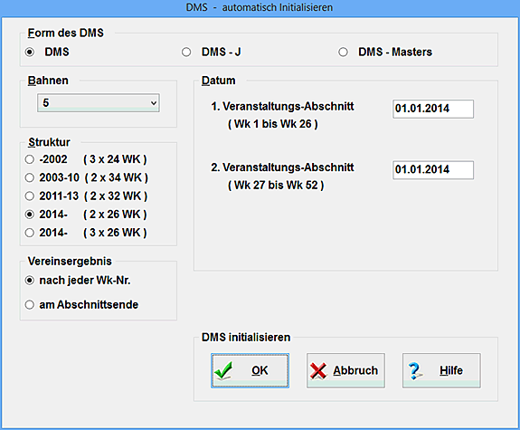 Ebenso legen Sie hier fest, ob es sich um eine DMS-Veranstaltung handelt. Aktivieren Sie das betreffende Kästchen, so führt CPS-SCHWIMM nach dem Drücken des OK-Schalters eine automatische DMS-Initialisierung [Kapitel 1.1.2] durch, wobei die Wettkampf-Titel [Kapitel 2.2] etc. automatisch angelegt werden.