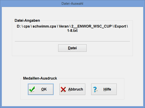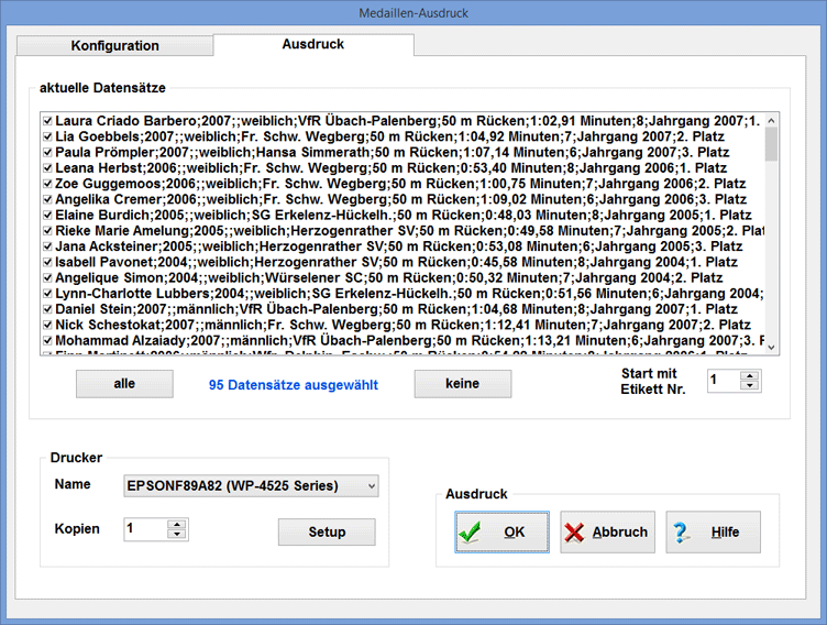 Nach Auswahl der betreffenden Daten-Datei starten Sie mit dem OK-Schalter den Medaillen-Direktausdruck [Kapitel 11.1.1], ein starkes Zusatztool, welches mit minimalem Arbeitsaufwand die Daten auf die Medaillen-Aufkleber druckt.