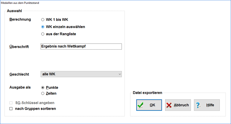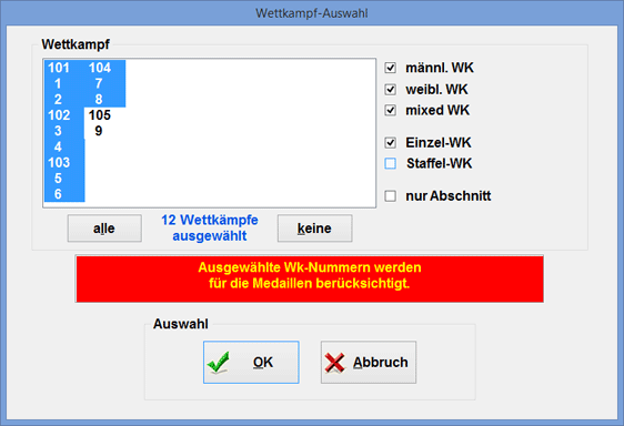 Erst nachdem Sie hier Wettkämpfe ausgewählt haben, ist der OK-Schalter für den Medaillen-Export aktiviert.