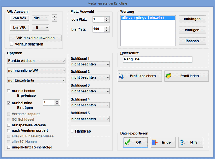 Damit Sie später nicht erneut alle Einstellungen vornehmen müssen, können Sie diese als Profil speichern Sobald Sie diese Angaben zu einer Rangliste wieder benötigen, brauchen Sie nur noch das entsprechende Profil laden.