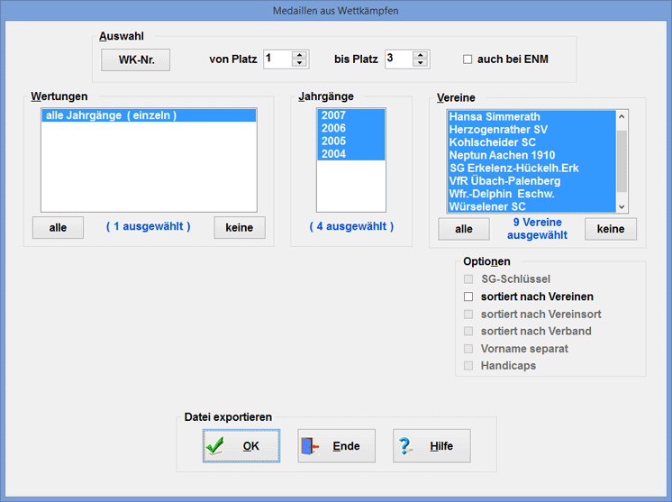 Normalerweise erhalten ENM-pflichtige Schwimmer keine Medaillen. Ist das betreffende Kontrollfeld aber aktiviert, so werden auch ENM-pflichtige Schwimmer in die Datei aufgenommen.