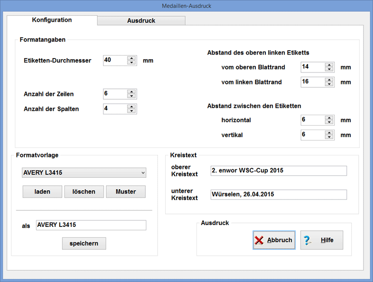 Beim Direktausdruck von Medaillen [Kapitel 11.1.1] können Sie die verschiedensten Medaillen-Einstellungen als Formate abspeichern und später bei Bedarf wieder laden.
