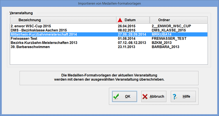 Manchmal ist es aber wünschenswert, die Medaillenformate einer anderen Veranstaltung vorliegen zu haben. Deshalb können Sie hier die Medaillen-Formatvorlagen einer anderen Veranstaltung in ihre derzeitige Veranstaltung importieren.