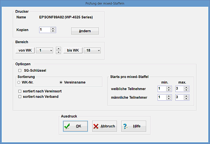 Nach Auswahl des Druckers und des WK-Bereiches, den Sie überprüfen möchten, bestimmen Sie das weitere Layout der auszugebenden Liste: