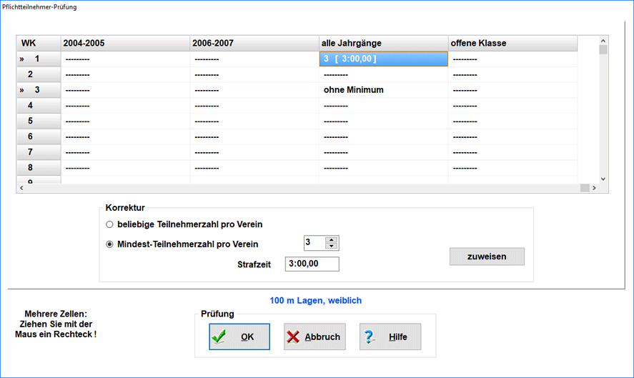 Die hier vorgestellte Prüfung ist z.B. dann sinnvoll, wenn für das Vereinsergebnis die Endzeiten von 3 Teilnehmern addiert werden sollen. Meldet der Verein nun weniger als 3 oder wird diese Zahl durch Disqualifikationen, Abmeldungen etc. unterschritten, so würde diese Mannschaft aus der Wertung fallen. Manche Ausschreibung sieht für solche Fälle Strafzeiten vor, um die Mannschaft in der Wertung zu halten.